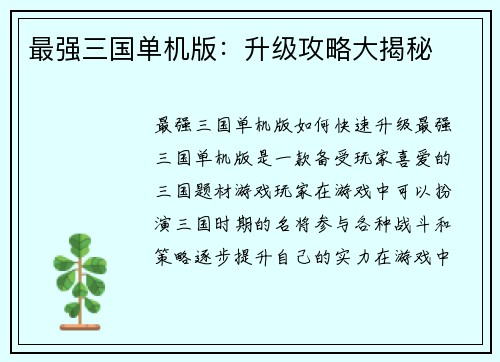 最强三国单机版是一款备受玩家喜爱的三国题材游戏,玩家在游戏中可以扮演三国时期的名将,参与各种战斗和策略,逐步提升自己的实力。在游戏中,快速升级是玩家追求的目标之一。本文将从多个方面介绍如何快速升级,帮助玩家在游戏中取得更好的成绩。