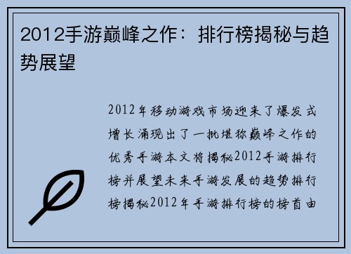 2012年,移动游戏市场迎来了爆发式增长,涌现出了一批堪称巅峰之作的优秀手游。本文将揭秘2012手游排行榜,并展望未来手游发展的趋势。