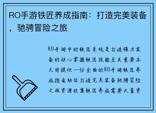 《RO手游》中的铁匠系统是打造强力装备的核心,掌握铁匠技能至关重要。本文将提供一份全面的RO手游铁匠养成指南,助你打造完美装备,驰骋冒险之旅。